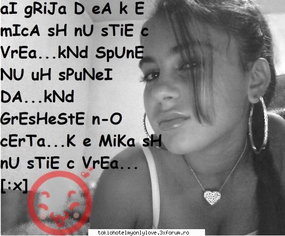poi....imi place un baiat dar el a zis k nu vrea sa stea k mne ptru k st prea draguta j nu vrea sa ma raneasca intr-un fel sau sa-si bata jok de mne...ptru el k alea k acre sta isi bate jok de ele..plus k ma apara mereu la sc...si nu numai el....sunt cea mai aparata in intreaga scoala j mai moolt de tigani